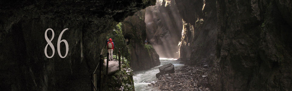 Ein Kassenhäuschen bezeichnet den Eingang zur Klamm. Wir zahlen ein paar Euro, dann sind wir drin. Rechts und links ragen Felsen rund 80 Meter in die Höhe. Der Abstand zwischen ihnen ist so gering, dass die Sonne nur selten den Grund der Schlucht erreicht. Den Grund - das heißt die Partnach, die ungebärdig und wild schäumend durch die Felsenge schießt. Hier unten ist die Luft kühl. Obwohl es Sommer ist, sind wir froh, uns etwas wärmer angezogen zu haben - anders als einige Besucherinnen, die mit T-Shirts und auf hochhackigen Schuhen durch die Klamm staksen und alles andere als glücklich aussehen. Unser zweiter Eindruck neben der Kühle: Es ist laut, und zwar so laut, dass man sich an manchen Stellen nur brüllend verständigen kann. Was für ein faszinierender Ort, der bei jedem Schritt einen neuen Anblick bereit hält! Welch ein Hexenkessel, in dem das Wasser wild tost, in dem es über Felsblöcke springt, sich in Strudeln dreht und dabei mit einer solch urtümlichen Kraft durch die Schlucht schießt, dass es empfindsamen Seelen glatt Angst machen kann! Nicht zuletzt deshalb, weil die Partnach an vielen Stellen beinahe zum Greifen nah ist.