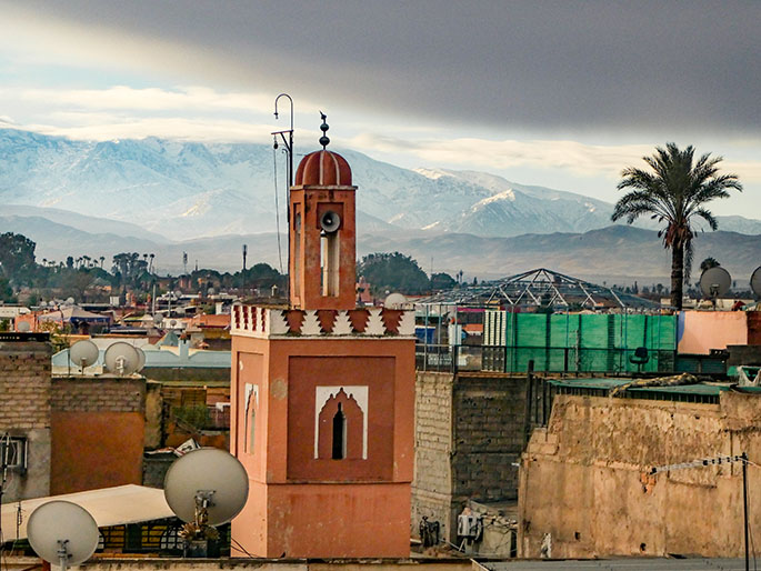 Wir stehen auf der Dachterrasse des "Riad el Borj" und lassen unsere Blicke über die Stadt schweifen. Um uns herum erstreckt sich die Medina mit ihrem Häusergewirr, dazwischen ragen die Minarette mehrerer Moscheen empor, von denen die Muezzine fünf Mal am Tag die Gläubigen zum Gebet rufen. Ein Ereignis mit Atmosphäre, ein authentisches Stück Orient - das allerdings durchaus auch lästig sein kann, wenn man Tag für Tag lange vor Sonnenaufgang von einem minutenlangen lauten Sprechgesang aus dem Schlaf gerissen wird. Am Horizont sind die Viertausender des Hohen Atlas mit ihren schneebedeckten Gipfeln zu erkennen, davor wiegen sich hier und da Palmen im Wind. Angesichts eines solchen Szenarios ist es kein Wunder, dass der Marrakesch-Tourismus seit Jahren beständig zunimmt. Seit 2006 haben sich die Übernachtungskapazitäten beinahe verdoppelt, und noch mehr sind im Entstehen, viele davon in weiteren sanierten Riads in der Altstadt. Dabei profitiert das Königreich zu einem erheblichen Teil von der inneren Stabilität, die es verglichen mit anderen islamischen Staaten zu einem Ausnahmeland macht. Von wenigen Zwischenfällen abgesehen, hat der Terrorismus bis heute einen Bogen um Marokko gemacht, und der König und seine Regierung unternehmen alles, damit es so bleibt. Sollte ihnen das gelingen, wird die Bedeutung Marrakeschs als Reiseziel in den nächsten Jahren wohl weiter zunehmen - dieser "Perle des Orients" mit ihren Bauwerken aus einer großen Vergangenheit, mit ihrer quirligen Altstadt und den farbenfrohen Märkten, mit der einzigartigen Lage zwischen Meer, Hochgebirge und der Sahara sowie mit ihren freundlichen Menschen. Und nicht zuletzt mit ihren Riads, diesen kleinen Palästen mit der Atmosphäre aus "1001 Nacht".